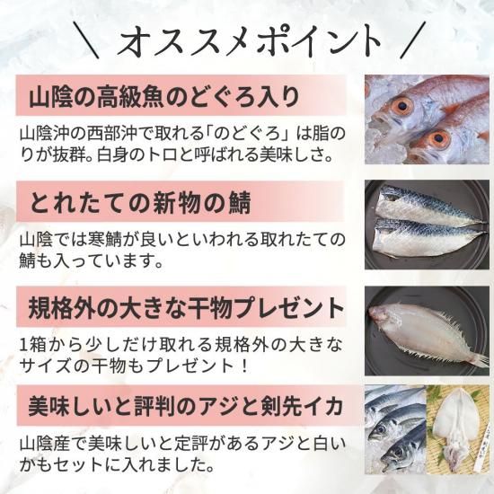 人気の干物「あじ」「のどぐろ」「白いか」「さば」の4点にプラスで、